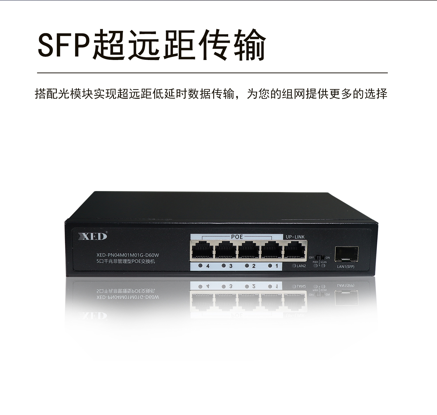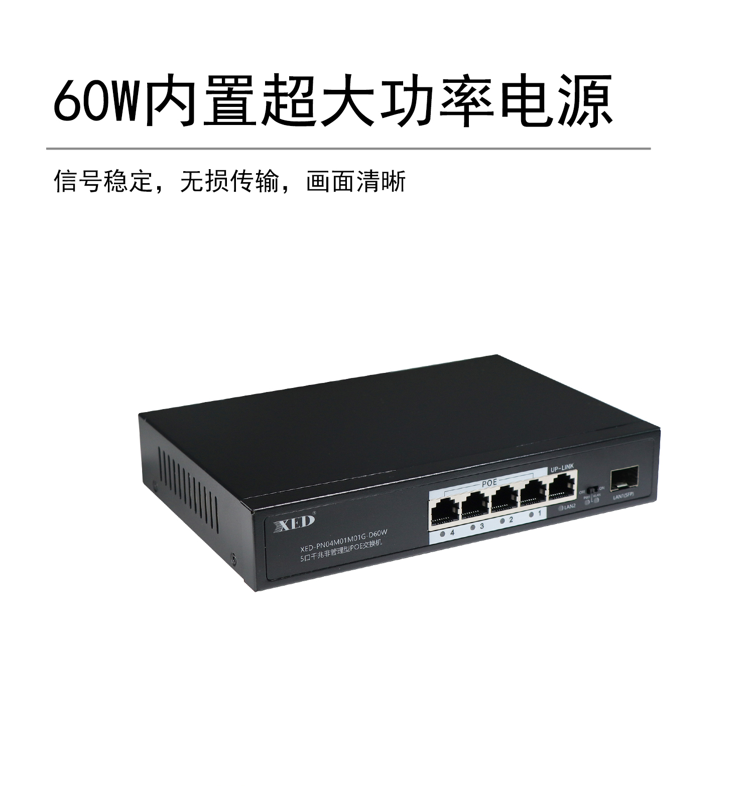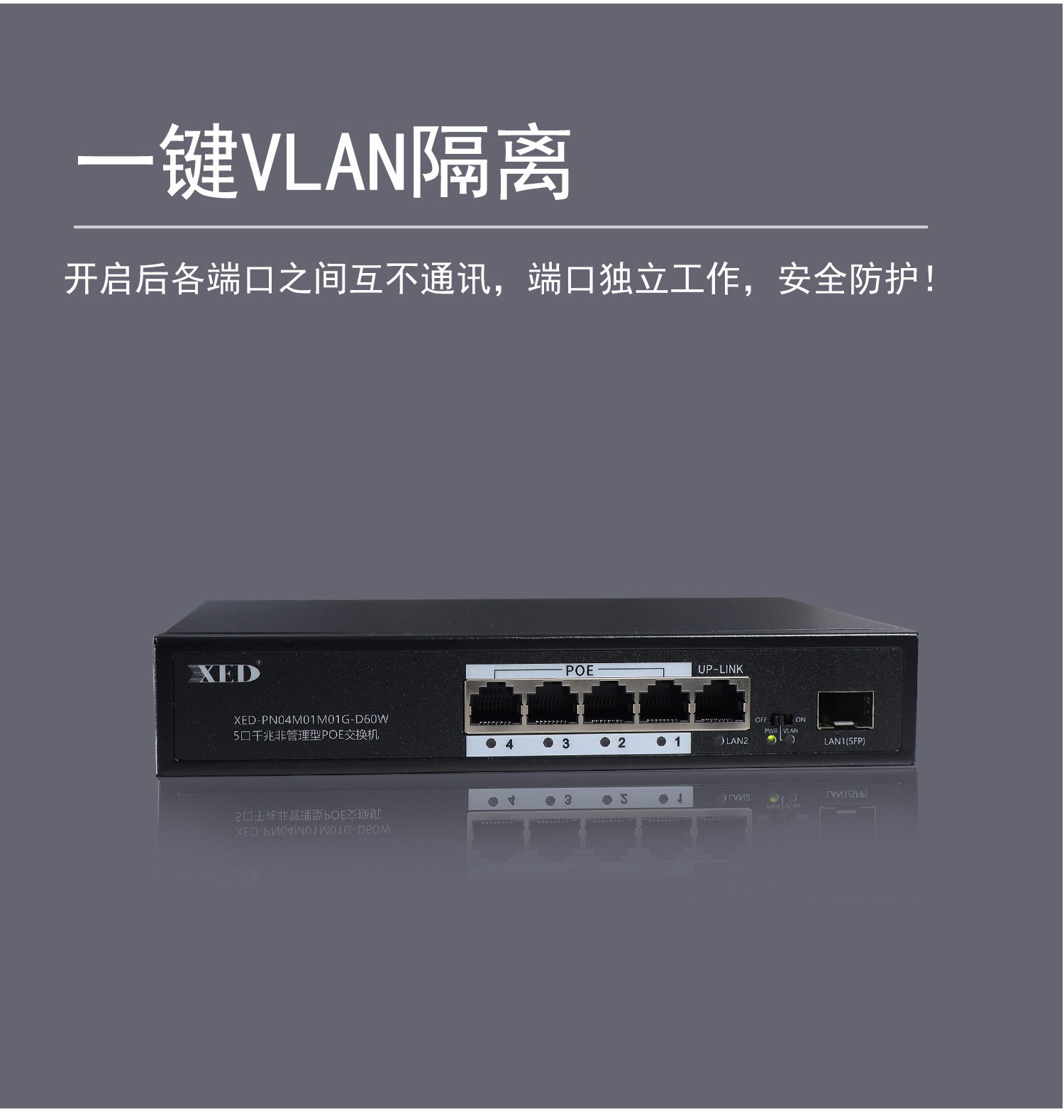 XED-PN04M01M01G-D60W 4+1千兆POE交换机,可通过网线为无线AP,摄像头等PD设备提供最大单端口30W供电,支持一键开启VLAN模式,完全满足新一代组网需求,适用家庭,酒店,中小企业等各类场景;为您构建更安全、更快速、可增值的可靠网络。