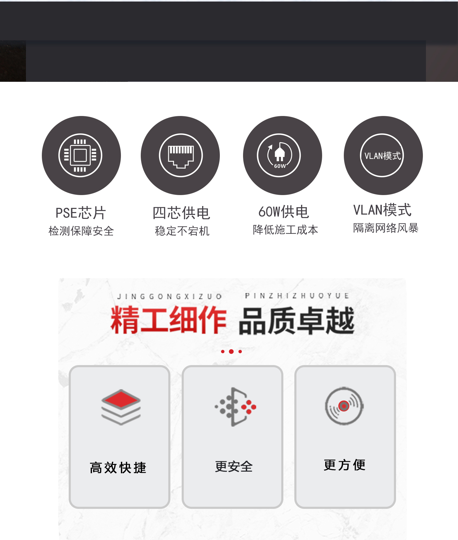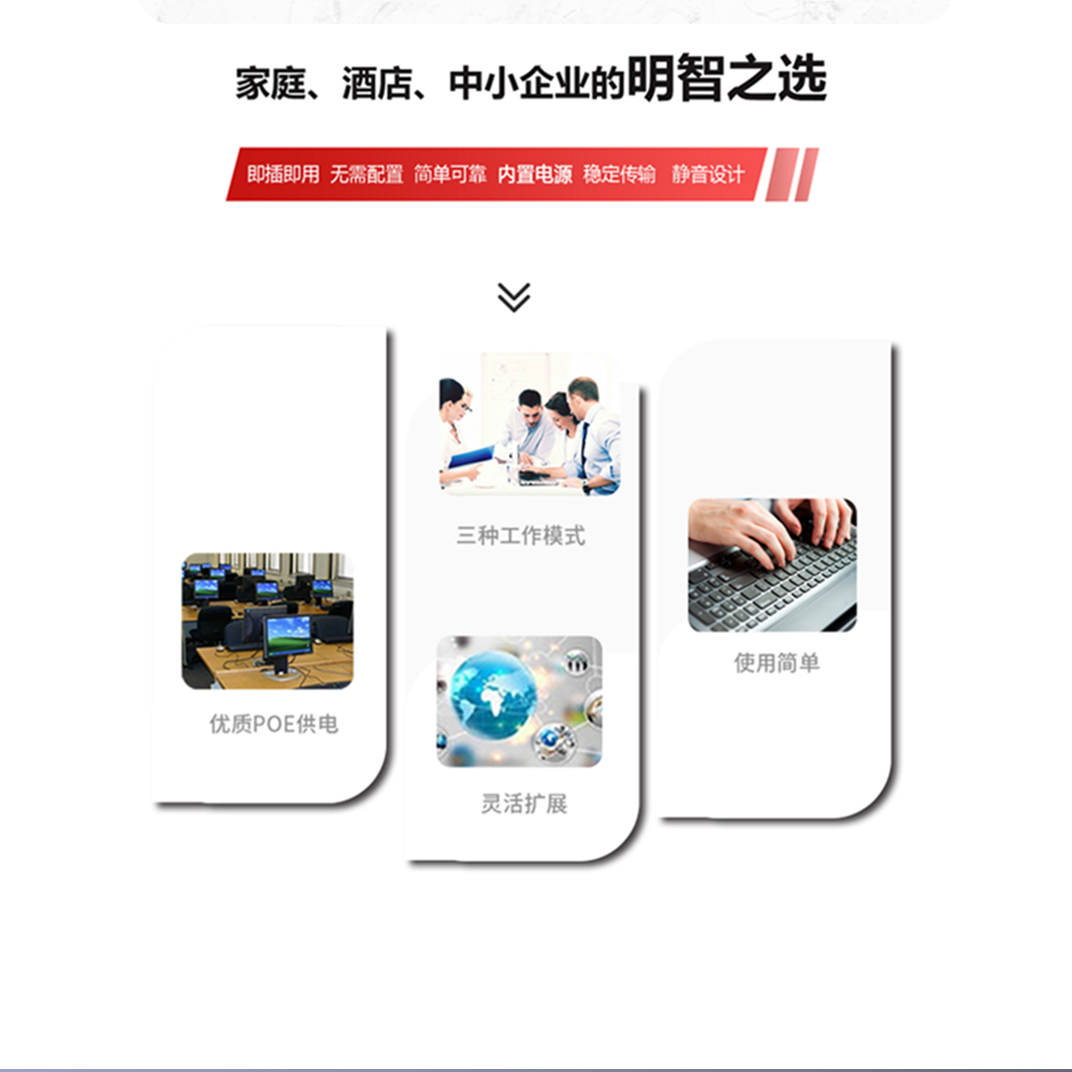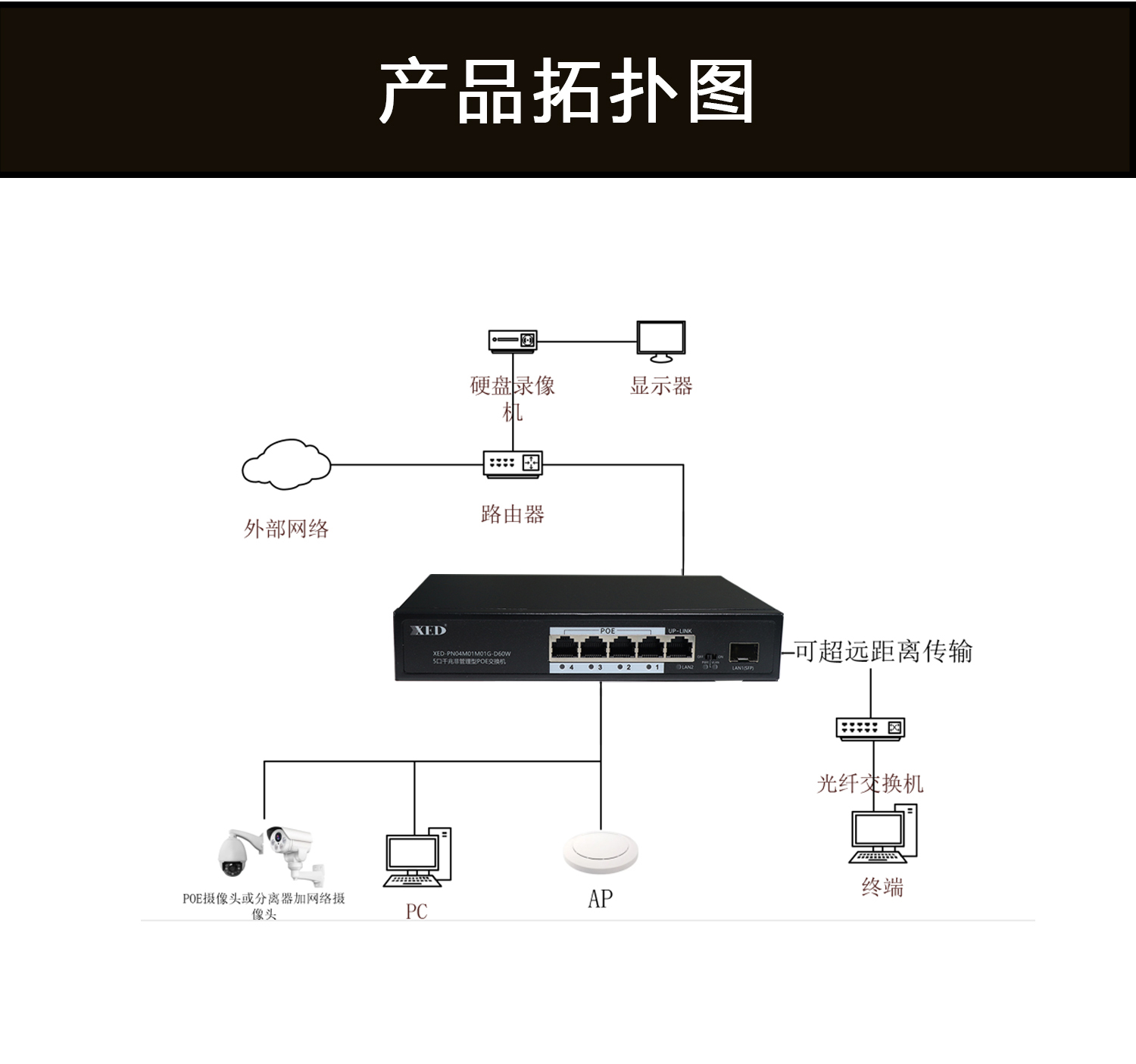 XED-PN04M01M01G-D60W 4+1千兆POE交换机,可通过网线为无线AP,摄像头等PD设备提供最大单端口30W供电,支持一键开启VLAN模式,完全满足新一代组网需求,适用家庭,酒店,中小企业等各类场景;为您构建更安全、更快速、可增值的可靠网络。