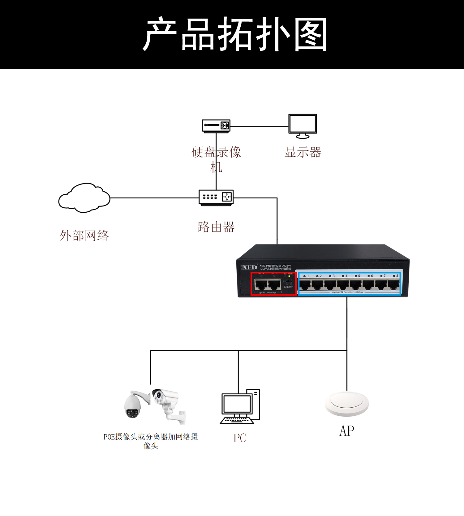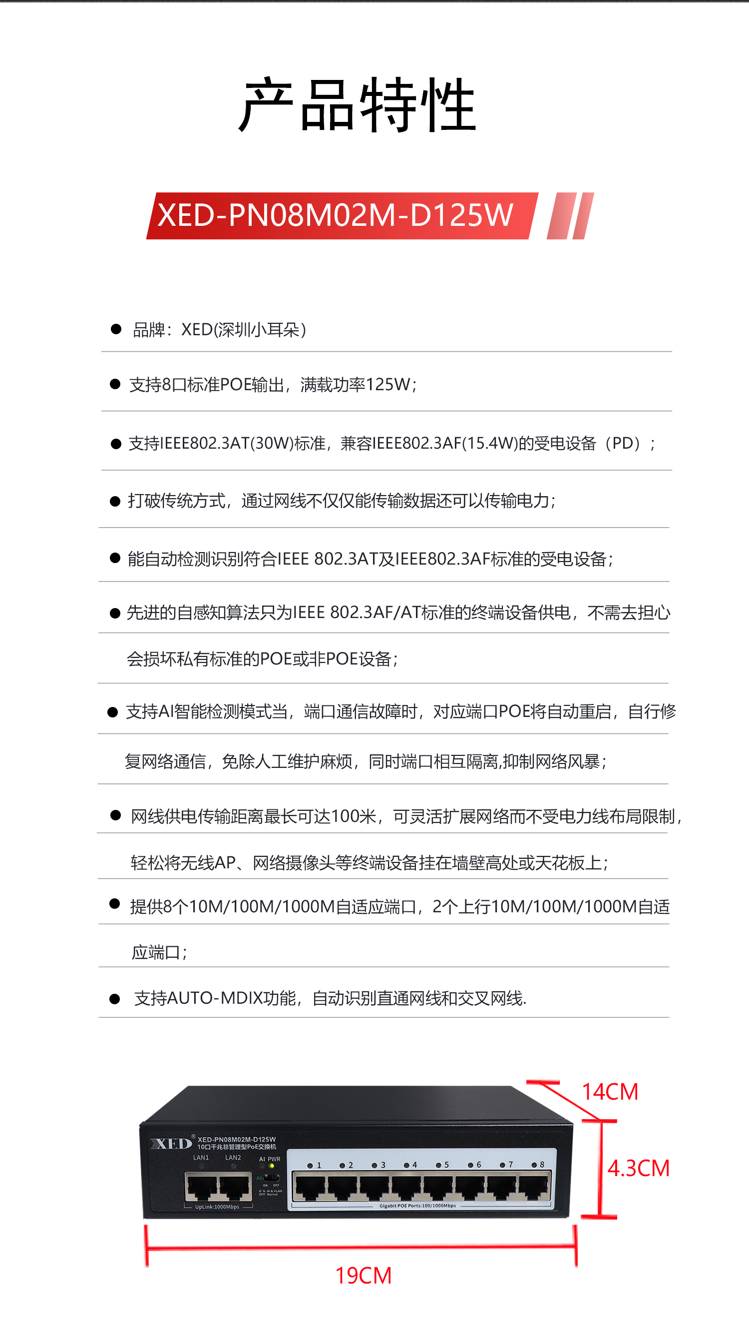 XED-PN08M02M-D125W是一款高性能的全千兆POE交换机,可通过网线为无线AP,摄像头等PD设备提供最大单端口30W供电,有效满足远距离供电布线传输需要,完全满足新一代组网需求,适用家庭,酒店,中小企业等各类场景;为您构建更安全、更快速、可增值的可靠网络。